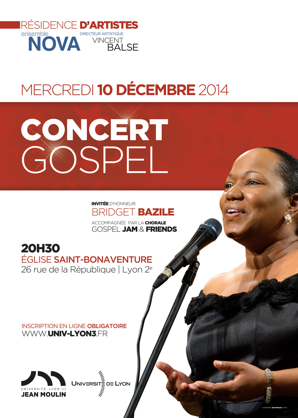Pour cette occasion, Bridget Bazile sera entourée des choristes du ch?ur Gospel Jam and Friends et des musiciens de l’Ensemble Nova, en résidence d'artistes à Lyon 3, dirigé par Vincent Balse.