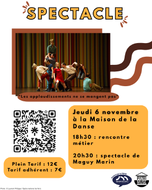 Patrimuse vous propose une soir¨¦e ¨¤ la Maison de la Danse ! Au programme rencontre m¨¦tier ¨¤ 18h30 puis venez d¨¦couvrir le spectacle de Maguy Marin ? Les applaudissements ne se mangent pas ? ¨¤ 20h30. Il est possible de r¨¦server le spectacle sans la visite (option gratuite).