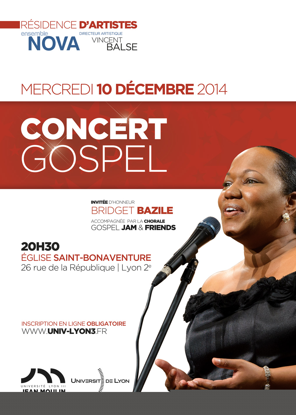 Pour cette occasion, Bridget Bazile sera entourée des choristes du ch?ur Gospel Jam and Friends et des musiciens de l’Ensemble Nova, en résidence d'artistes à Lyon 3, dirigé par Vincent Balse.